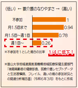 また、地域の「健康づくり」「生きがいづくり」の場に週1回程度参加すると、参加していない場合より要介護となる比率が約1/4になるといわれています。