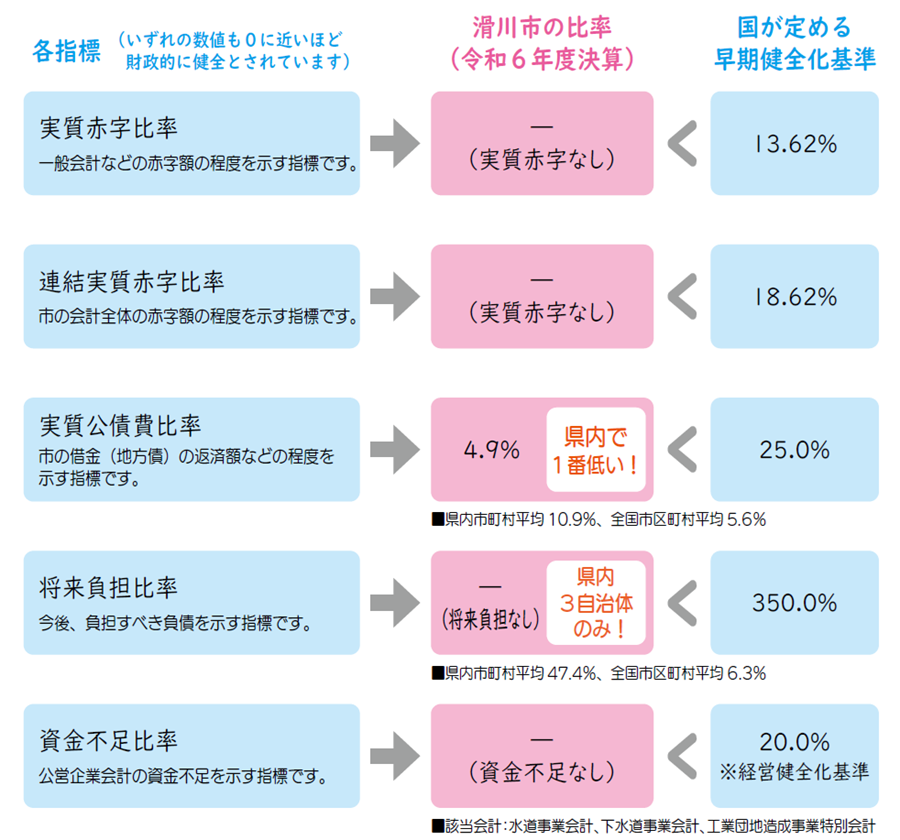 くらし ―令和6年度決算に基づく健全化判断比率などの状況― 2/33 前の記事 次の記事 発行日 : 2025年11月01日 自治体名 : 富山県滑川市 広報紙名 : 広報なめりかわ 2025年11月号 地方公共団体の財政の健全化に関する法律の規定により、健全化判断比率および資金不足比率についてお知らせします。 今後も引き続き行財政改革を推進し、健全な財政運営に努めてまいります。 健全化判断比率の見込み 滑川市健全な財政に関する条例の規定などによりお知らせします。 Tweet シェアする 中期財政計画 イベント情報(1)