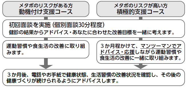 特定健診を受診した方のうち、生活習慣病のリスクが高い方に対して、生活習慣を見直すサポートを行うものです。