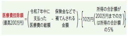 自分や自分と生計が一緒の家族のために令和7年中に支払った医療費がある場合は、右記のとおり計算した金額を医療費控除として、所得金額から差し引くことができます。事前に領収書や医療費通知を整理して、対象となる金額を集計した明細書を作成してください。