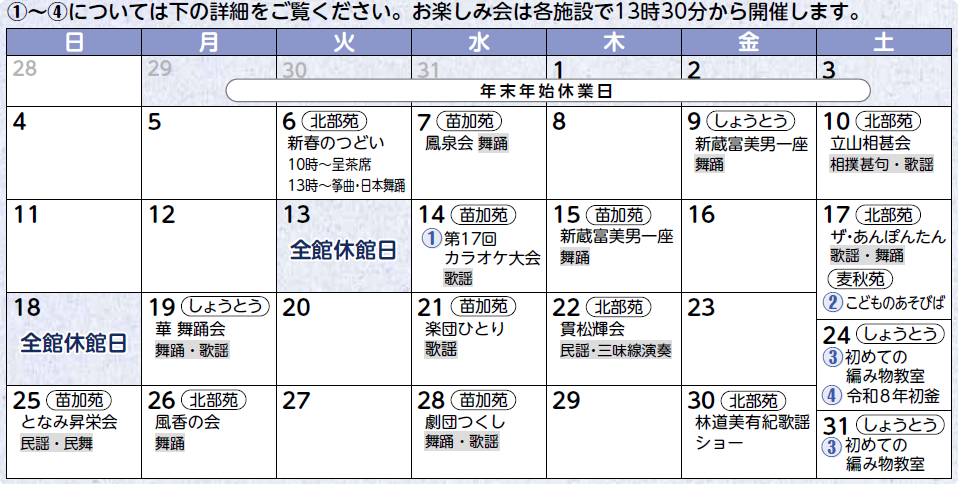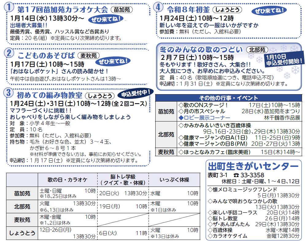 〈多世代交流施設利用時間8時30分~17時(苗加苑・北部苑の入浴時間は10時~16時です)〉