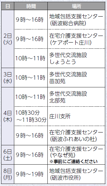 市内9か所で認知症相談日を設けています。物忘れや認知症に関して、ご本人やご家族等、どなたでも相談してください。相談日以外の日時でもご相談に応じます。