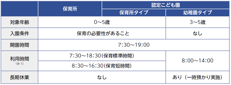 3歳以上のお子さんは保育所・幼稚園の2つのタイプを選択でき、0~2歳のお子さんは保育の必要性があることが条件になります。