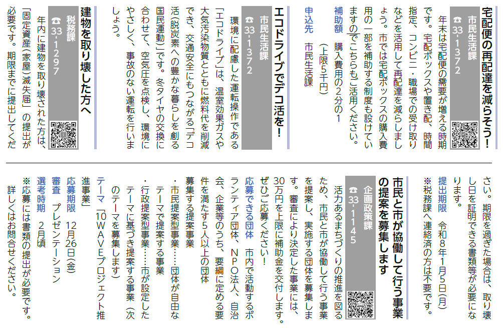 くらし くらしの情報インフォメーション【くらし・行政】(1) 11/40 前の記事 次の記事 発行日 : 2025年11月25日 自治体名 : 富山県砺波市 広報紙名 : 広報となみ 令和7年12月号 Tweet シェアする 豪雨から地域を守る農地防災事業の話 くらしの情報インフォメーション【くらし・行政】(2)