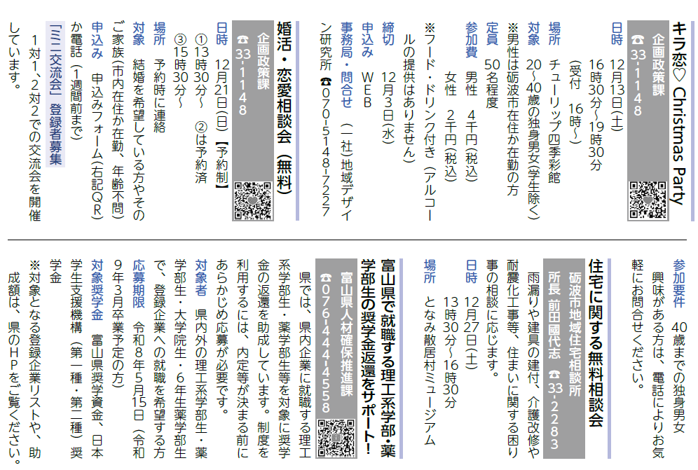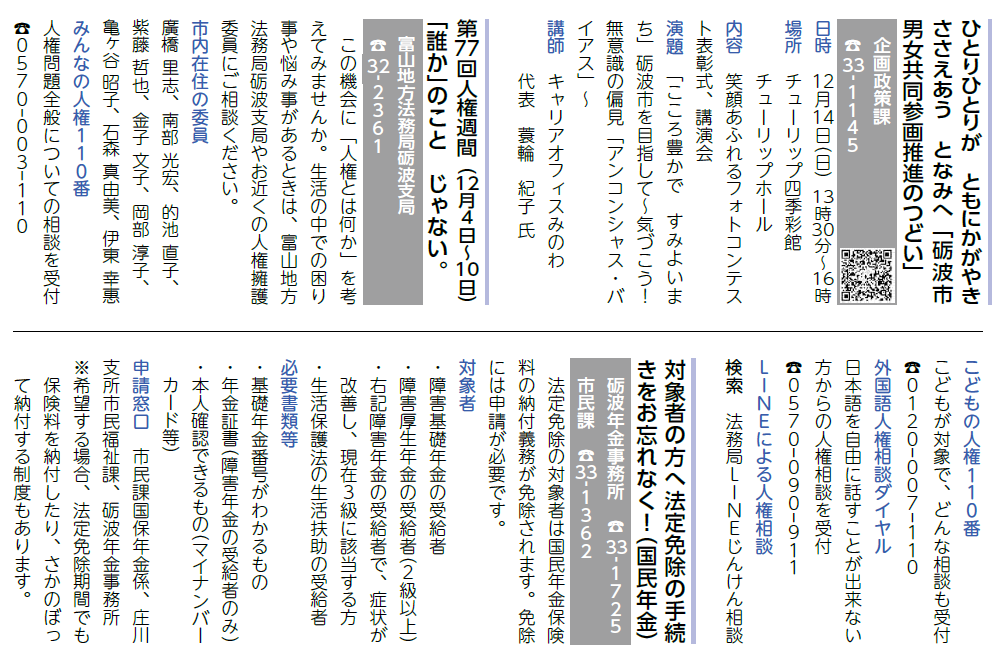 くらし くらしの情報インフォメーション【くらし・行政】(2) 12/40 前の記事 次の記事 発行日 : 2025年11月25日 自治体名 : 富山県砺波市 広報紙名 : 広報となみ 令和7年12月号 Tweet シェアする くらしの情報インフォメーション【くらし・行政】(1) くらしの情報インフォメーション【くらし・行政】(3)