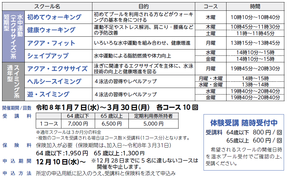 スポーツ スイミングスクール受講生募集 18/40 前の記事 次の記事 発行日 : 2025年11月25日 自治体名 : 富山県砺波市 広報紙名 : 広報となみ 令和7年12月号 問合せ:砺波市温水プール 【電話】33-4450 Tweet シェアする 自衛官等の募集 くらしの情報インフォメーション【講座・教室】