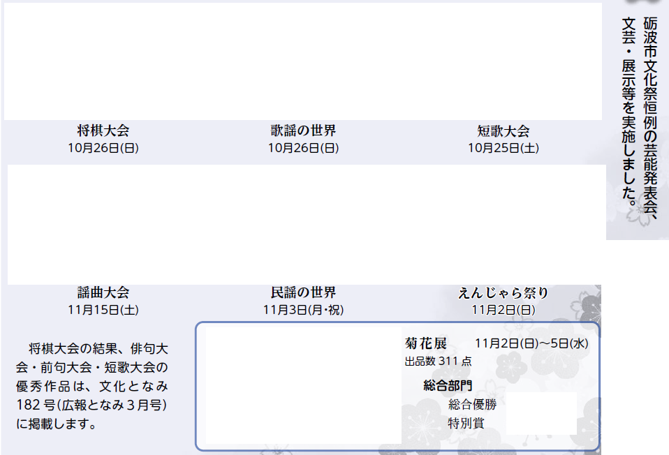 文化 文化となみ第181号(令和7年12月号)(1) 30/40 前の記事 次の記事 発行日 : 2025年11月25日 自治体名 : 富山県砺波市 広報紙名 : 広報となみ 令和7年12月号 ※詳細は、本紙P.26をご覧ください。 Tweet シェアする シルバー人材センターだより 文化となみ第181号(令和7年12月号)(2)