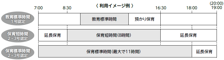 施設の利用は、1号認定の子どもは、各施設の開園時間内で認定された教育標準時間の利用ができます。2号・3号認定の子どもは、世帯の状況に応じて保育を受けられる時間帯が短時間と標準時間に区分されます。