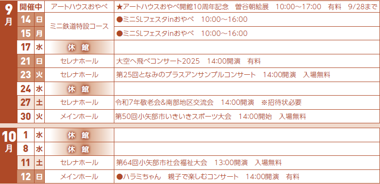 ●印はクロスランドおやべ、★印はアートハウスおやべの主催(共催)イベントです