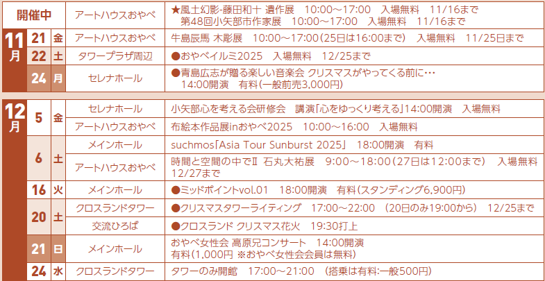 ●印はクロスランドおやべ、★印はアートハウスおやべの主催(共催)イベントです