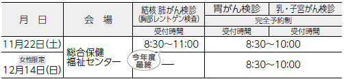検診車による検診です。胃・乳・子宮がん検診と骨粗しょう症検診は、完全予約制で受診には申し込みが必要です。なお各会場には定員があり、申し込み多数の場合は、別の検診会場への変更をお願いすることがあります。