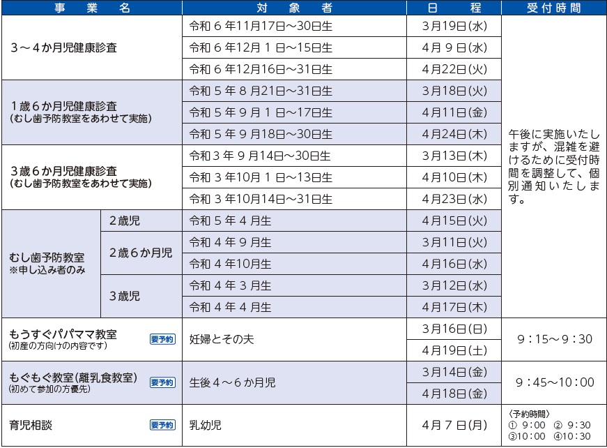 ●乳幼児健診、教室等の日程