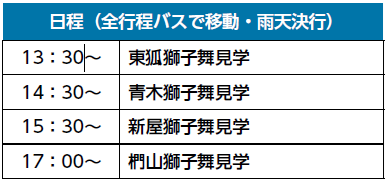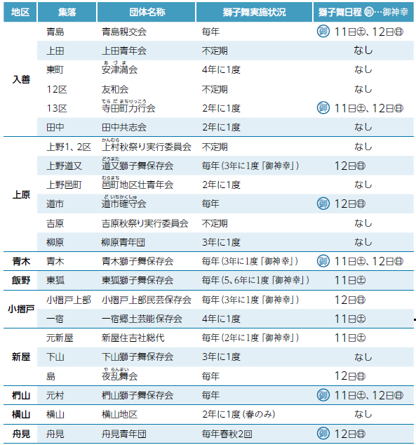 秋祭り獅子舞の日程は左表のとおりです。御神幸を行う地区では、一行がおみこしを担いで地域を練り歩き、各家々で獅子舞や手踊りなどを披露します。