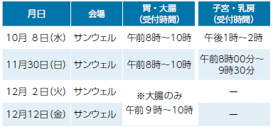予約方法:ウェブサイト上か元気わくわく健康課 保健センターに電話で予約(結核・肺がん検診、特定健康診査、大腸がん検診は予約不要)。