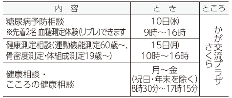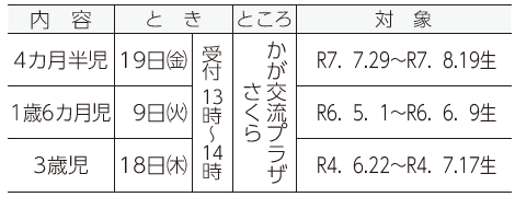 内容:身体計測、発育・発達・ことば・子育て等の育児相談、離乳食のすすめ方や食事等の栄養相談。