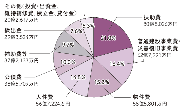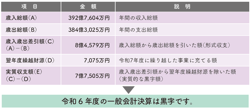 令和6年度一般会計決算額は、歳入が392億7,604万円、歳出が384億3,025万円で、令和7年度に繰り越した事業に充てるお金を差し引いた実質収支は、7億7,505万円の黒字となりました。