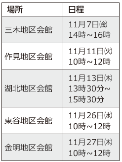 相談員がスマホの使い方やちょっとした疑問を個別にお答えします。また、11月はお近くの地区会館でも開催いたします(下図参照)。