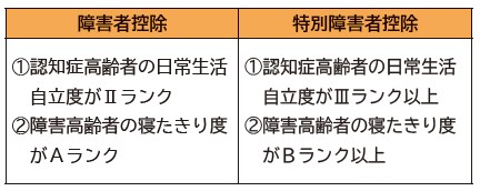 65歳以上の要介護(要支援)認定者で右表に該当する人には、申請により「障害者控除対象者認定書」を交付します。本人またはその家族などが所得税や市民税・県民税の申告の際に認定書を添付することで、身体障害者手帳などがなくても、障害者控除または特別障害者控除の適用を受けられます。
