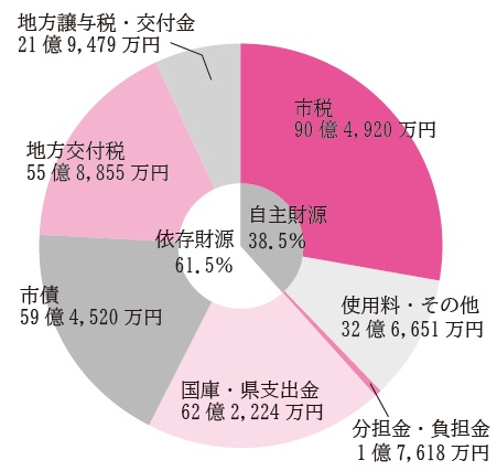 市税が最も大きく、全体の4分の1以上を占めています。市税をはじめとした自主財源の比率は38.5%で、残る61.5%は地方交付税や国庫支出金、市債など、ほかに依存した財源となっています。
