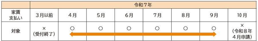 補助対象:令和7年4月1日から9月30日までに支払った賃貸料(下記矢印の期間)