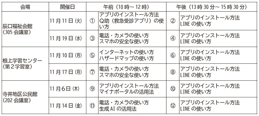 スマホの操作に慣れていない人を対象に、安全な使い方、便利機能の使い方などを学ぶことができる講座を開催します。講座は全部で12回開催する中から好きな講座を選択し、参加することができます。
