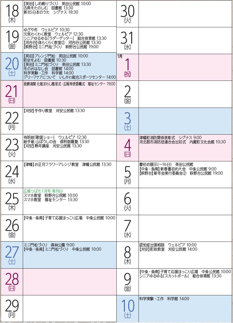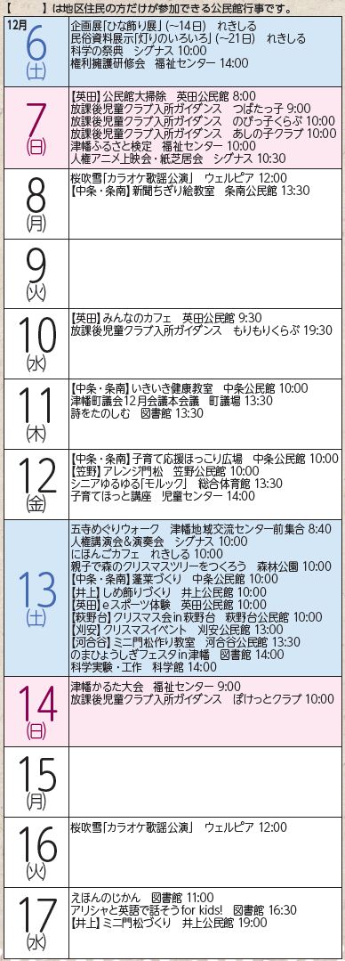 イベント 令和7年(2025)12月イベントカレンダー 46/48 前の記事 次の記事 発行日 : 2025年12月05日 自治体名 : 石川県津幡町 広報紙名 : 広報つばた 2025年12月号 最新の開催情報は主催者・各施設にお問い合わせください Tweet シェアする 令和7年12月くらしのカレンダー(2) 電話番号一覧
