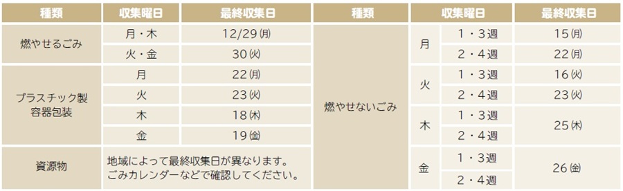 12/26(金)まで通常通り収集します。燃やせるごみは12/30(火)に特別収集を行います。