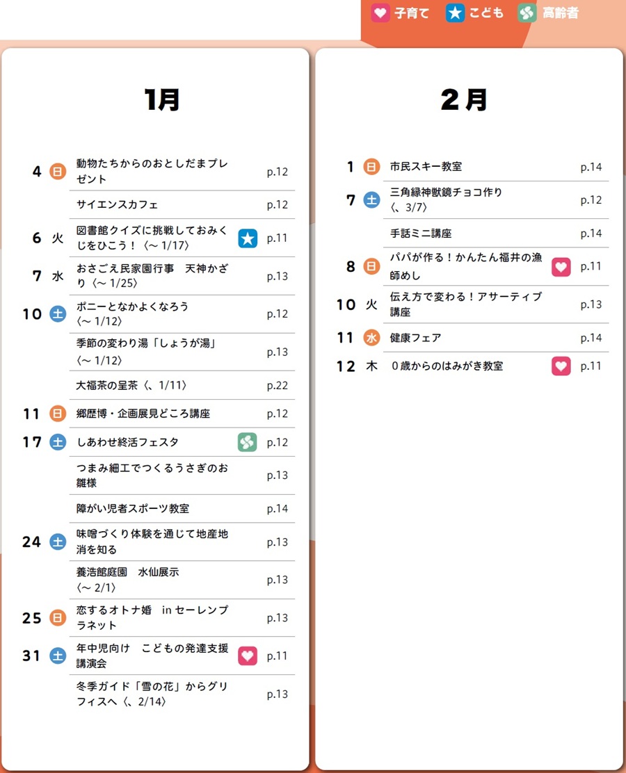 イベント EVENTS イベントカレンダー 6/33 前の記事 次の記事 発行日 : 2026年01月01日 自治体名 : 福井県福井市 広報紙名 : 広報ふくい 2026年1月号 1・2月に実施、または申し込みを開始する福井市のイベント情報をお知らせします。 詳しくは、表に記載されている各ページや市ホームページをご覧ください。 Tweet シェアする 令和6年度 決算概要 EVENTS イベント情報