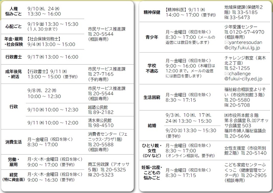 くらし 9月の無料相談 27/32 前の記事 次の記事 発行日 : 2025年09月01日 自治体名 : 福井県福井市 広報紙名 : 広報ふくい 2025年9月号 ※こどもの悩みごとは、毎日(火曜日除く)9:00~18:00に、こども家庭センター分室(アオッサ5階)でも受け付けます。 【電話】20-1541(相談専用) Tweet シェアする INFORMATION 福井市の情報-募集 9月の福井けいりん