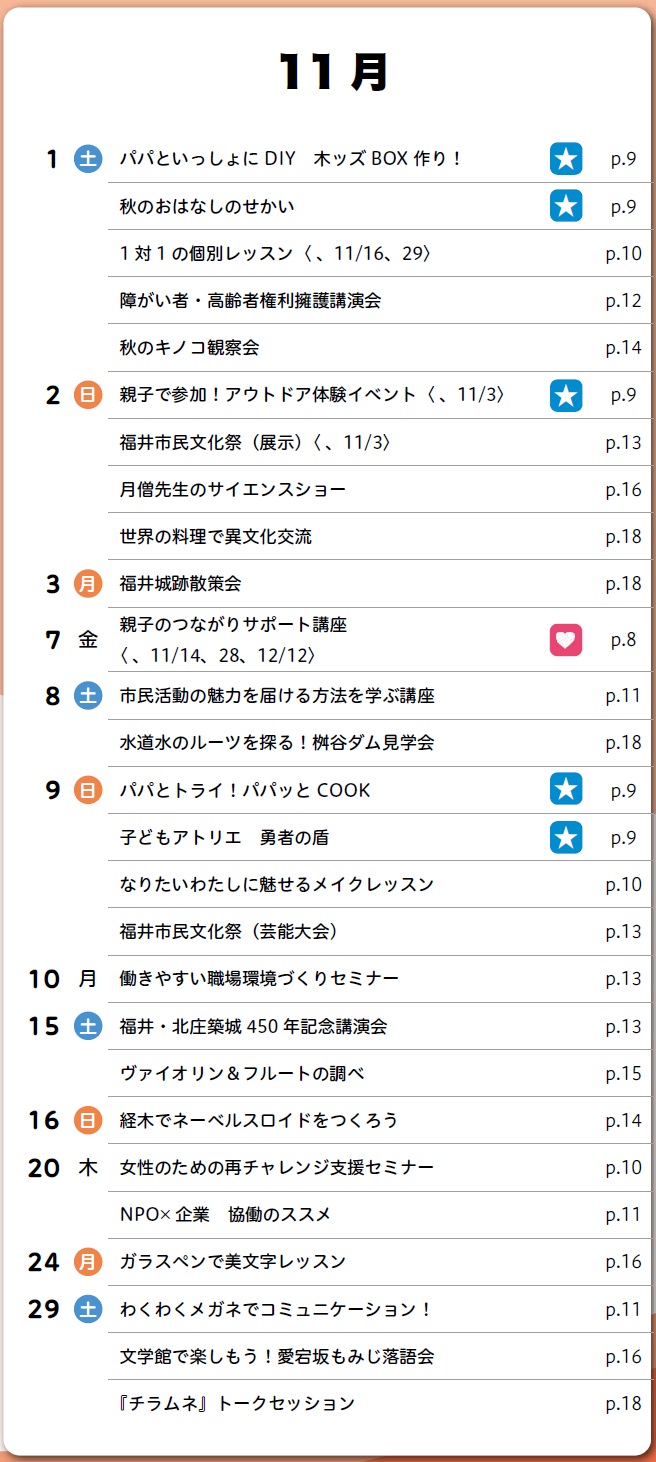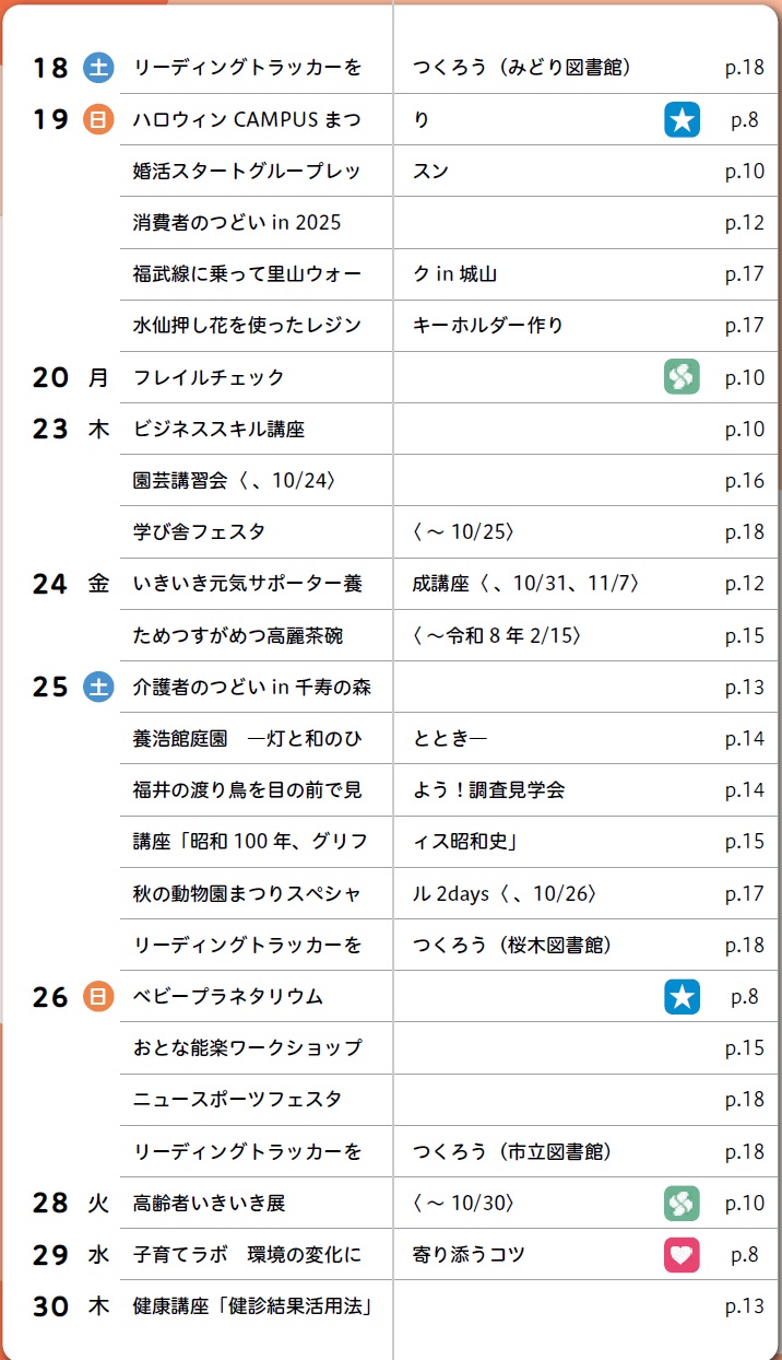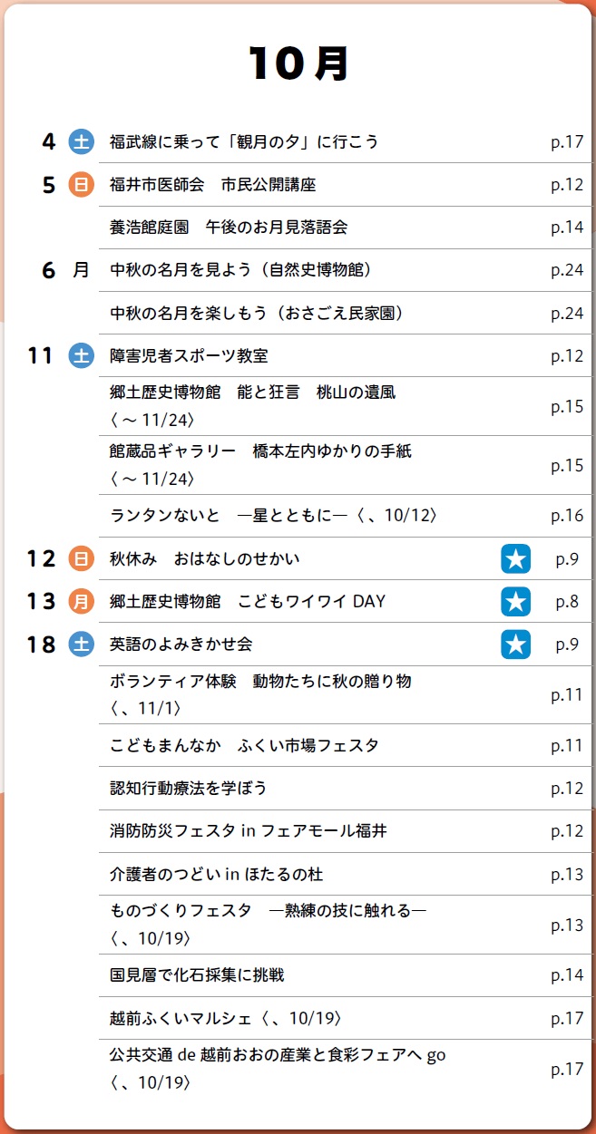 イベント EVENTS イベントカレンダー 3/36 前の記事 次の記事 発行日 : 2025年10月01日 自治体名 : 福井県福井市 広報紙名 : 広報ふくい 2025年10月号 10・11月に実施、または申し込みを開始する福井市のイベント情報をお知らせします。詳しくは、表に記載されている各ページや市ホームページをご覧ください。 Tweet シェアする 都市・福井のはじまり―北庄築城450年―(2) EVENTS イベント情報