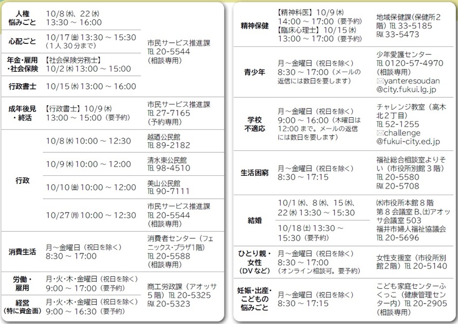 くらし 10月の無料相談 31/36 前の記事 次の記事 発行日 : 2025年10月01日 自治体名 : 福井県福井市 広報紙名 : 広報ふくい 2025年10月号 ※こどもの悩みごとは、毎日(火曜日除く)9:00~18:00に、こども家庭センター分室(アオッサ5階)でも受け付けます。 【電話】20-1541(相談専用) Tweet シェアする INFORMATION 福井市の情報-募集 10月の福井けいりん