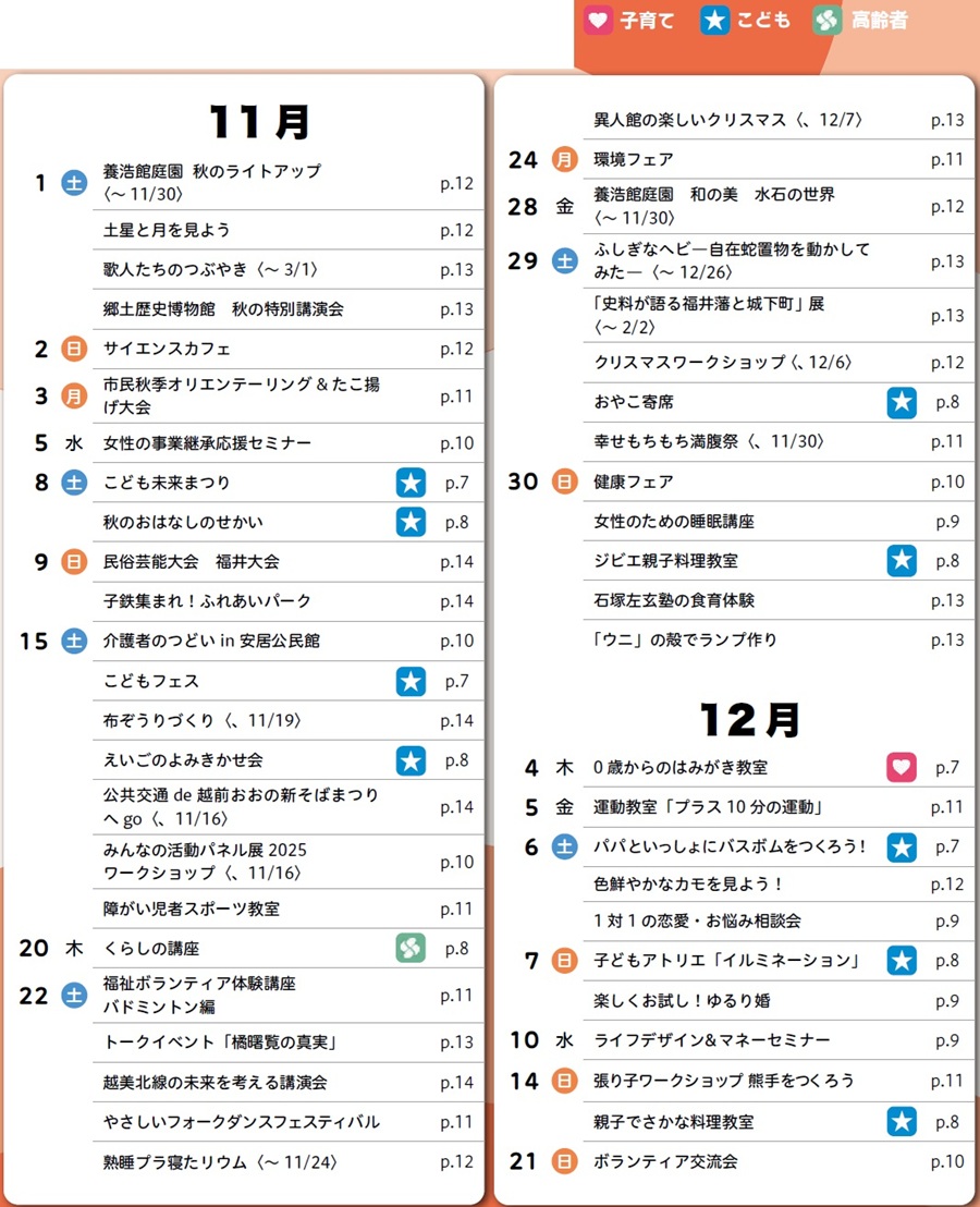 イベント EVENTS イベントカレンダー 3/32 前の記事 次の記事 発行日 : 2025年11月01日 自治体名 : 福井県福井市 広報紙名 : 広報ふくい 2025年11月号 11・12月に実施、または申し込みを開始する福井市のイベント情報をお知らせします。 詳しくは、表に記載されている各ページや市ホームページをご覧ください。 Tweet シェアする 11月は「こどもまんなか月間」です こどもの笑顔がふくいを変える!(2) EVENTS イベント情報
