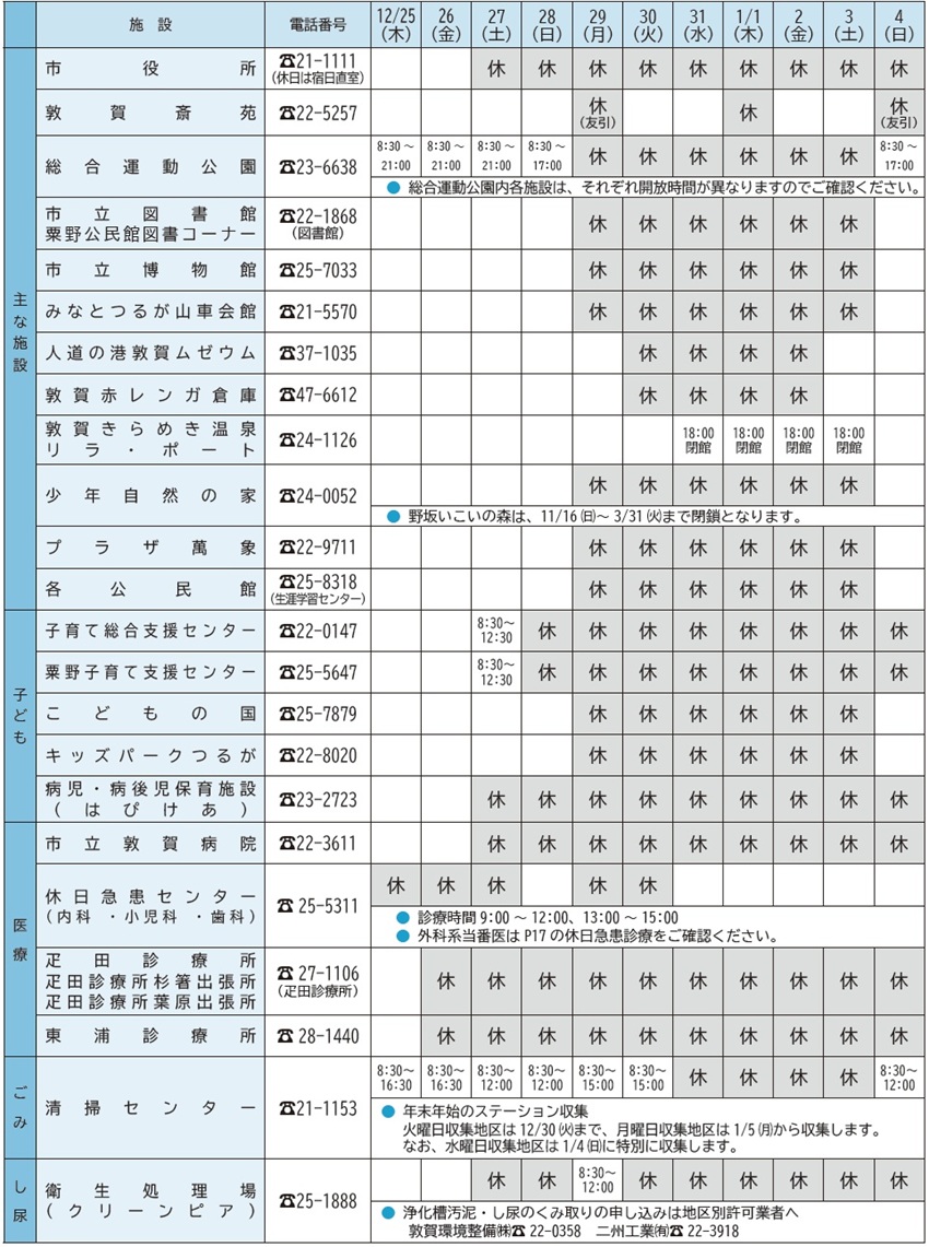 くらし 年末年始の業務案内 17/33 前の記事 次の記事 発行日 : 2025年12月09日 自治体名 : 福井県敦賀市 広報紙名 : 広報つるが 令和8年1月号 市の施設や医療機関などの情報をお知らせします。 Tweet シェアする 令和8年4月1日から市営駐車場の利用料金などが変わります 休日急患診療