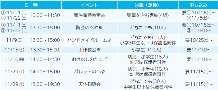 ・リニューアル工事中のため、それぞれの開催日だけ入館ができます。また、入口についてはイベント当日にご案内します。