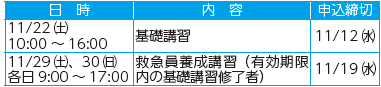 日常生活での急病人などに対して、医師や救急隊に引き継ぐまでの応急手当を学びます。対象は満15歳以上の方。電話にて申し込みください。詳細は市HPをご覧ください。