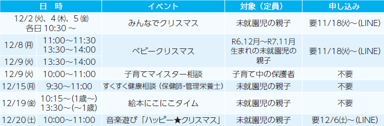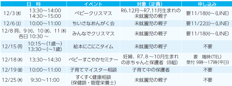 ※「ベビークリスマス」「みんなでクリスマス」は、両センターでいずれか1回のみの参加とさせていただきます。