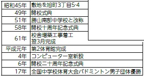 昭和29年(1954)の市制発足以来進めてきた中学校の統廃合計画は、南部中学校(以下南中)の開校で完了した。南中は平泉寺中学校と勝中の一部を統合して成立した。4月1日の開校式では生徒代表の結川君が「平泉寺と勝中の伝統を踏まえ私たちの手で新しい南部中学校の伝統を築こう」と挨拶した。以下、当校の主な出来事は表1を見ていただきたい。この年の在校生は表2の通りで現在の生徒数の3倍近かった。