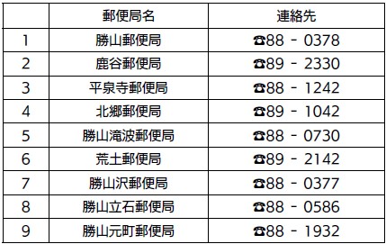 ※荒土郵便局:13:00~14:00の窓口業務の休止時間を除く