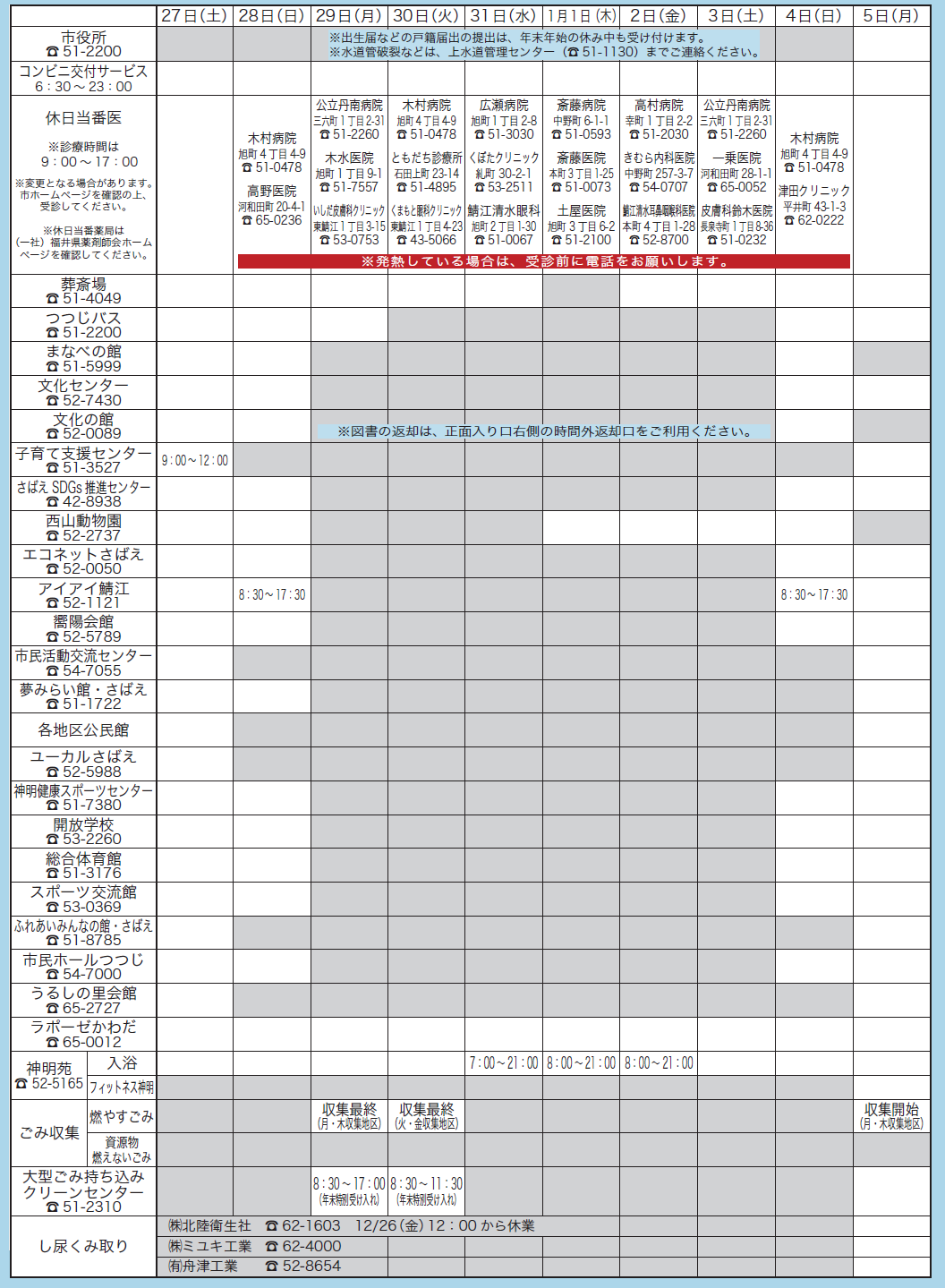 くらし 年末年始の業務案内 32/35 前の記事 次の記事 発行日 : 2025年12月25日 自治体名 : 福井県鯖江市 広報紙名 : 広報さばえ 令和8年1月号 通常版 グレー箇所は業務を休みます。 Tweet シェアする 休日当番医(1月) 鯖江市議会から新年のご挨拶
