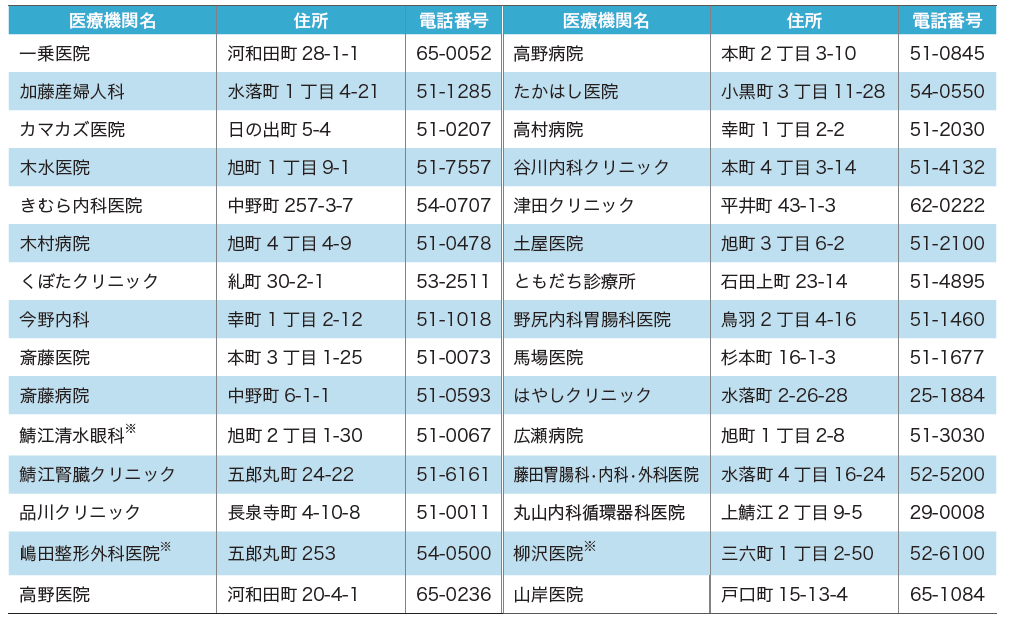 ※鯖江清水眼科と嶋田整形外科医院および柳沢医院はインフルエンザ予防接種のみ