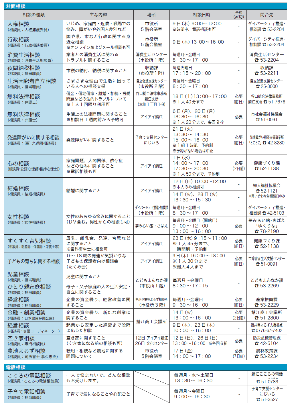 くらし 市民相談(10月) 34/39 前の記事 次の記事 発行日 : 2025年09月25日 自治体名 : 福井県鯖江市 広報紙名 : 広報さばえ 令和7年10月号 通常版 ※相談は全て無料、相談日は祝日を除きます。 ※施設の利用制限に伴い、相談者を限定させていただく場合があります。 Tweet シェアする となりの街から 越前市イベント情報 健幸コラム vol.81