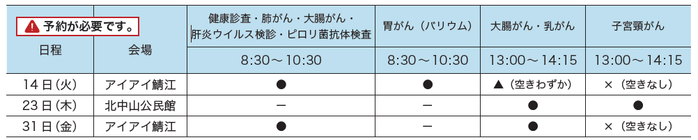 ※感染症の流行や気象状況などにより、予約受付や健診の実施状況が変わります。詳しくは市ホームページで確認、または健康づくり課(【電話】52-1138)までお問い合わせください。