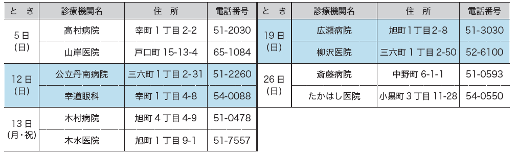 市ホームページの休日当番医表は本紙の二次元コード参照。