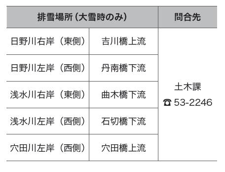 大雪になった場合には、排雪場所を開設します。開設場所は下の表のとおりです。