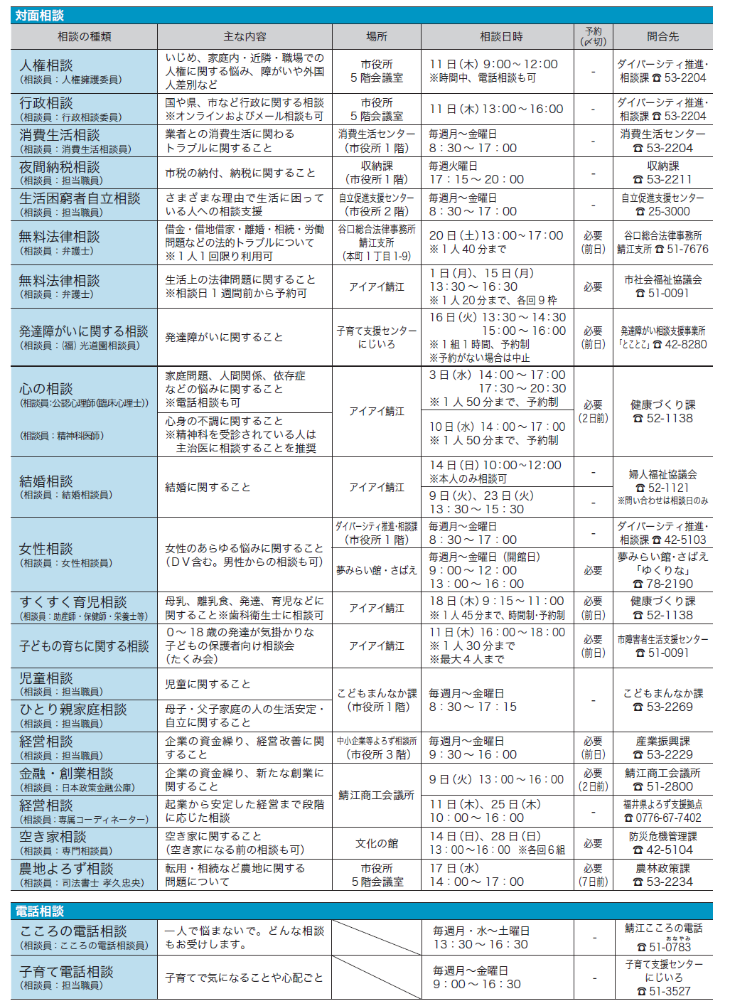 くらし 市民相談(12月) 31/36 前の記事 次の記事 発行日 : 2025年11月25日 自治体名 : 福井県鯖江市 広報紙名 : 広報さばえ 令和7年12月号 通常版 ※相談は全て無料、相談日は祝日を除きます。 ※施設の利用制限に伴い、相談者を限定させていただく場合があります。 Tweet シェアする となりの街から 越前市イベント情報 健幸コラム vol.83