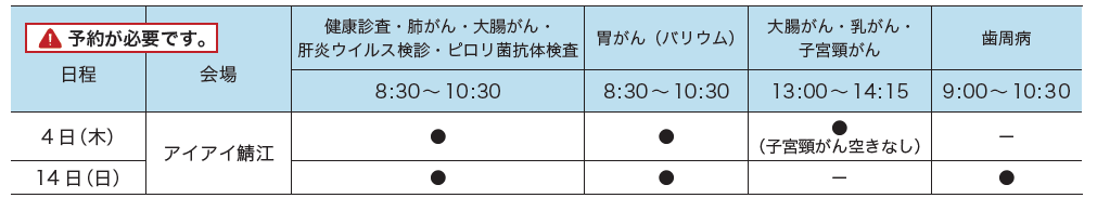 ※感染症の流行や気象状況などにより、予約受付や健診の実施状況が変わります。詳しくは市ホームページで確認、または健康づくり課(【電話】52-1138)までお問い合わせください。