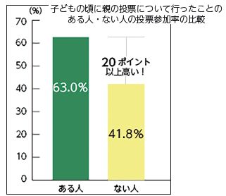 上のグラフのとおり、子どもの頃に親の投票について行ったことのある人・ない人で、投票参加率に大きな違いが見られます。