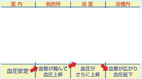 寒暖差による急激な血圧変動で起こる「ヒートショック」は、入浴時に寒い脱衣所から熱い浴室へ移動する際に起きやすく、失神や心筋梗塞、脳卒中などを引き起こす場合があります。