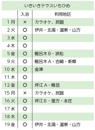 芦原地区の入浴送迎ワゴンは、お風呂の営業日に次の通り運行します。