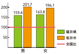 また、坂井市は、急性心筋梗塞の標準化死亡比※が男女ともに高いことから、その原因となる動脈硬化をまねく高血圧症の対策として「減塩」の取り組みを行っています。